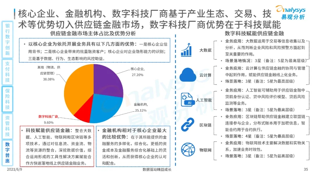 以大数据、人工智能、物联网、区块链等为代表的数字科技驱动金融产业数字化方兴未艾,数字科技使得金融和科技两个领域产生更紧密的场景联结,使得数字科技服务可以更早、更有效地介入到金融产业增长模型中去,更早的融入到企业和个人的资产生成过程,并从根本上提升金融机构资产透视能力和资产定价能力,帮助金融机构和实体部门降低成本、提升效率、增强用户体验及优化业务模式。